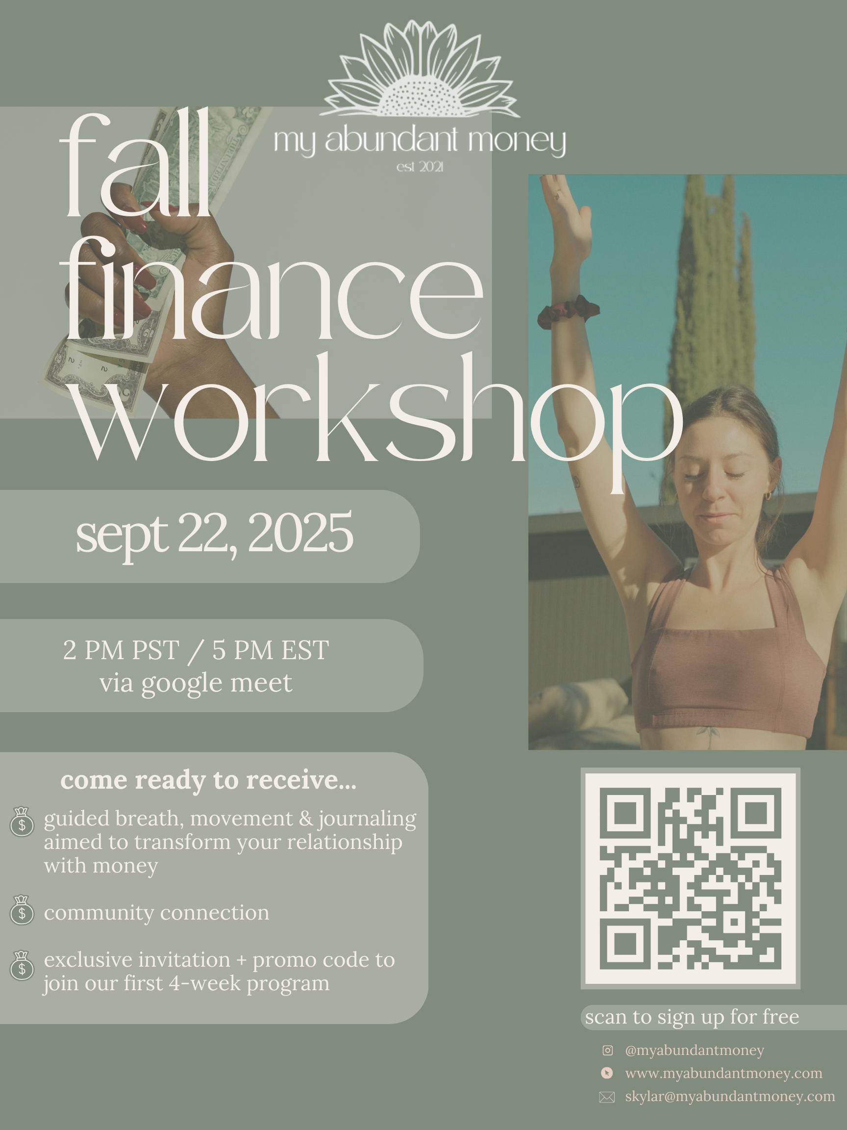 in this complimentary 90-minute guided workshop, you will receive a taste of the my abundant money program. come prepared with a journal and pen, as Skylar will guide you through a movement practice followed by a guided meditation and journaling exercise. those who attend will receive an exclusive invitation + promo code for the winter 4-week my abundant money cohort where you will receive hands-on support from Skylar, full access to the digital course including your very own finance dashboard, and community accountability.